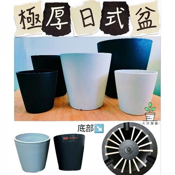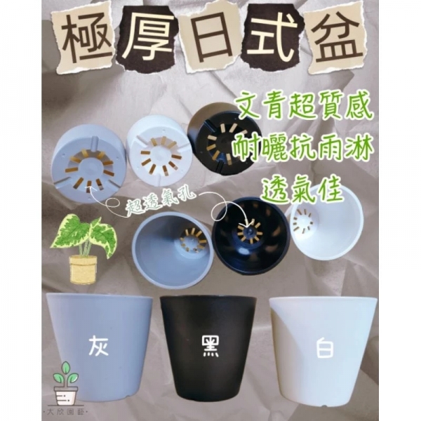 商品說明:日式極厚盆,手感佳質感特好,抗曬抗雨淋。單色素雅的外觀,低調卻又顯大方,充滿日式精簡洗鍊的風格。適合用在各種觀葉植物、多肉植物,尤其適合搭配塊根植物、龍舌蘭等。